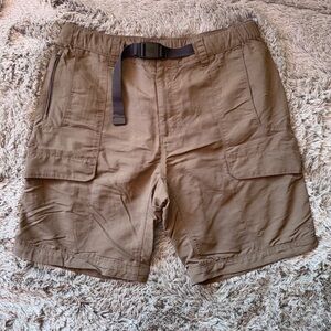 Crafted for outdoor enthusiasts, these tan cargo shorts offer a relaxed fit and are made from a durable, lightweight technical fabric. Perfect for hiking and camping, they feature an adjustable belt for a secure and comfortable fit. Has a tiny snag.