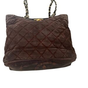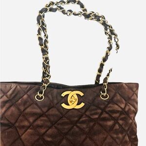 CHANEL Dark Brown Quilted Tote with Gold Chain