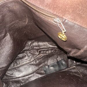 Suede exterior, leather interior. There are couple places on the strap with leather cracks and patch. Serial number was removed from interior button, there is a patch on the interior bottom to cover the tear. Wears on leather and discoloration.
