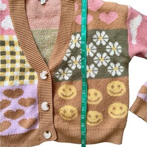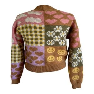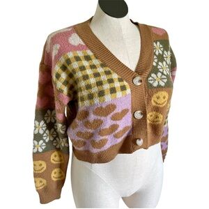 Charming cropped chunky cardigan by Debut featuring a playful patchwork print of gingham, daisies, hearts, and smiley faces. A perfect layering piece for spring.