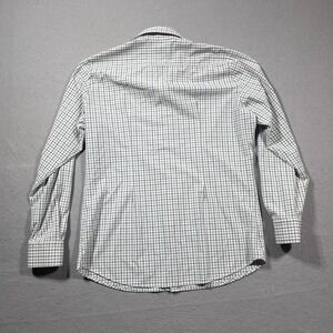 Leeward Collection button-down shirt features a moisture-wicking, high-stretch performance fabric designed for a crisp look with athletic comfort. This long-sleeve piece showcases a classic grid check pattern in green and navy over a white base, finished with a point collar and adjustable button cuffs. The trim fit silhouette provides a modern, tailored appearance suitable for both professional and casual settings.