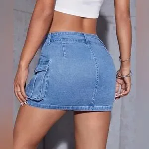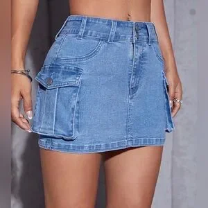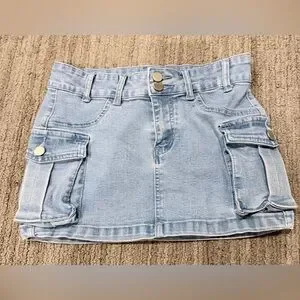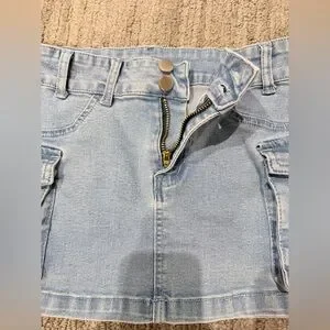 Junior Fit blue denim mini skirt with cargo pockets. Perfect for casual outings. Slim fit… size small is like size XS. Good for teens 12-14. Perfect condition. No stains. No damages.