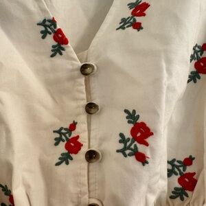 Elegant cream blouse with vibrant floral pattern. Features button-up front and matching belt. Ideal for a stylish look.