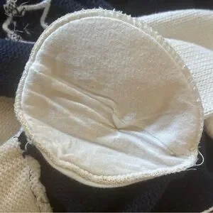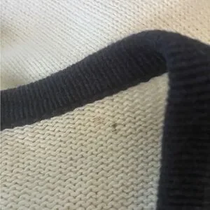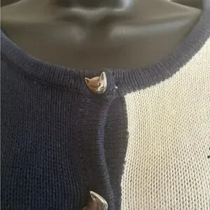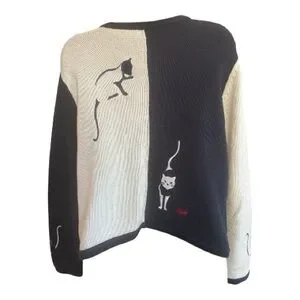 Adorable sweater featuring playful embroidered cat designs. Navy and white color scheme. Cats face buttons. Ideal for cat enthusiasts. From 2003. Has intact shoulder pads. Small mark on inside of sweater, not visible when being worn. Size large.