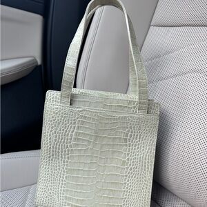 Chic light green bag with crocodile texture. Features a sleek design and gold accent. Ideal for elevating any look.