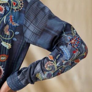 Kyra button down shirt by Johnny Was. Fiery blooms stand out against a cool, plaid background of azure shades, a dynamic design of embroidered florals and perched birds. Features button placket, shirttail and roomy fit. Machine washable cotton. Size XS but run large. Approximately 20” pit to pit, 28” long in front and 30” long in back.