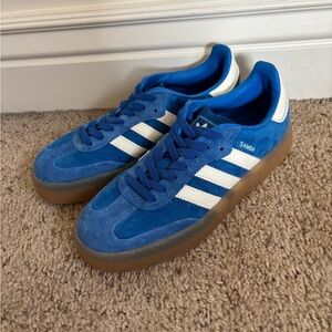 This is a pair of very lightly used Adidas Sambaes in a size 8. I wore them once before realizing they are a bit too big on me. I replaced the original laces with stretch laces that make the shoe much easier to slip on; you just tuck in the silver tabs as shown in the photos. I no longer have the original laces. Comes with the original box. Clean, smoke-free home.