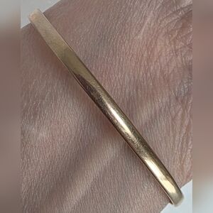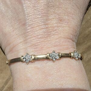 Vintage 1940's to 1980's 21 diamonds and hallmarked 10K solid gold bangle bracelet with latch by JDS or JOS. You can pull it apart enough to allow for a 7.5 inch inside circumference when closed. 2 3/4 inch diameter when latched. There are 18 × .03 carat to .05 carat diamonds and 3 × .07 carat diamonds. This was given to me. It belonged to my great aunt. It was hers; so I can comfortably give an age range on the piece. I wore it layered as seen in one of the photos. I will be listing the other two bracelets soon.