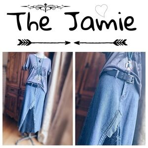 The Jamie is a maxi denim AEI skirt altered to perfection by me artist designer of Vintage Spiderwear. Details of denim and black cotton macrame for added flare and unique design. Unique back pockets with studded detailing , flat front with two smaller pockets. Size : 5 / 15” across waist and 33” L