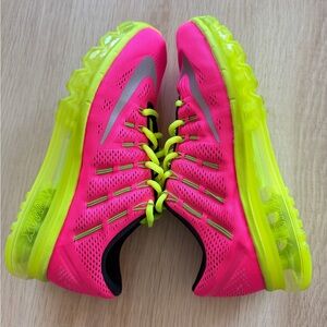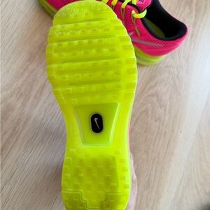Eye-catching Nike sneakers with vibrant pink upper and neon green sole. Perfect for sports and casual wear.