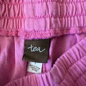 NWT bright pink pom Pom shorts from Tea Collection. Size 7. Elastic and tie waist and adorable Pom Poms along bottom edge. Pink color best represented by last close up photo. It’s a bright pink great for summer.