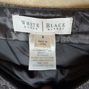 Keywords: White House Black Market, midi skirt, A-line, dark wash, pleated, stitched detail, business casual, professional, workwear, classic, tailored, flared skirt