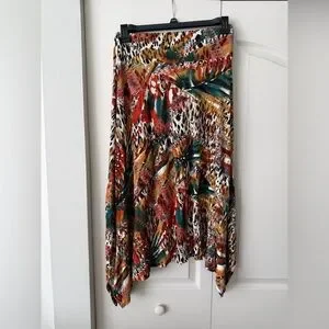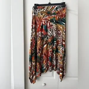 Eye-catching asymmetrical skirt with a mix of bold patterns. Perfect for a stylish statement.