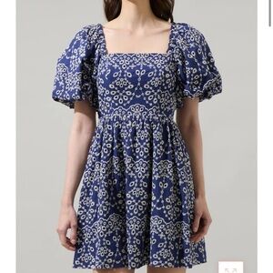 Chic mini dress with a square neckline. Features puff sleeves and a floral pattern. Perfect for casual outings.
