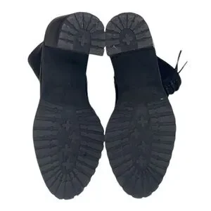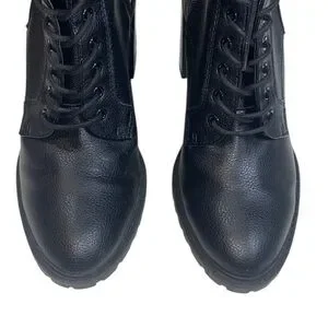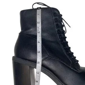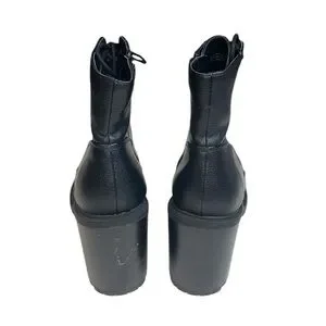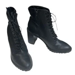 Good condition, has flaws. Ankle length, faux leather, has laces, a side functional zipper, an almond-toe, lug soles, and a high chunky block heel.