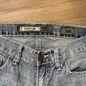 BKE Denim “Fulton” bootcut jeans in a light vintage wash with contrast stitching and signature embroidered back pockets.