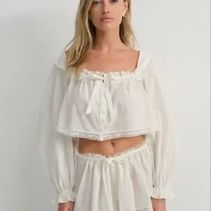 For wearing in and out of the house, the Venetia white long sleeve top is too chic to save only for sleep. This 100% cotton pajama top features long puff sleeves, functional front placket, lace trims throughout and a center-front bow. Pair it with the Venetia Sleep Short for a co-ord pajama set.
