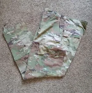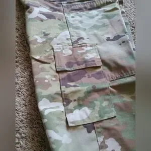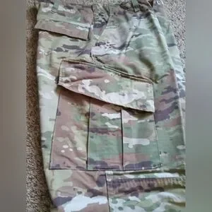 Army camouflage cargo pants with multiple pockets. Perfect for outdoor activities. Preowned. Size Large regular.