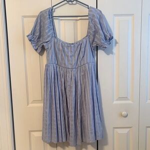 Charming blue dress with puff sleeves. Features a striped pattern. Perfect for casual outings.