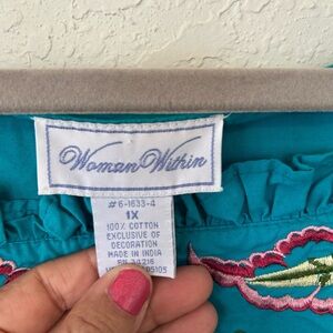 Charming teal dress by Woman Within. Features pink and green embroidery for added elegance.