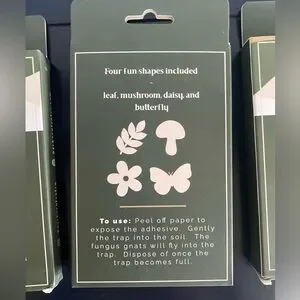 Each pack has 20 traps with 4 different natural shapes that each come with 5 Non-toxic, double-sided sticky traps that attract adult fungus gnats.