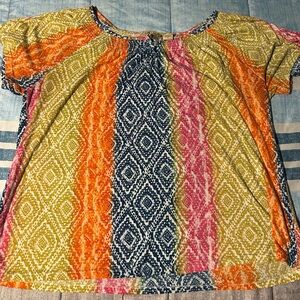 Embrace vibrant style with this multicolor bohemian print top. Perfect for casual outings, this top features a mix of orange, pink, green, and blue hues. Enjoy comfort and fashion in one piece. 1X
