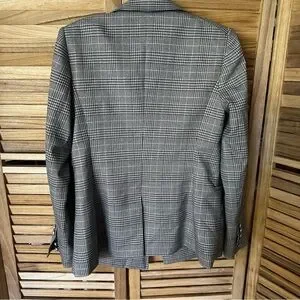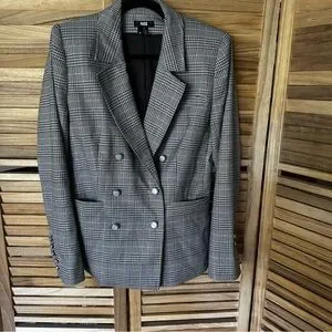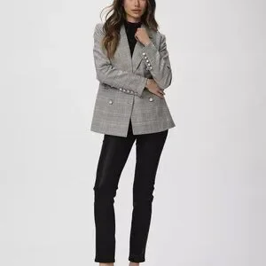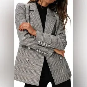 The luxe blazer that Crafted in our metallic plaid suiting material in grey with copper lurex throughout, this classic, double-breasted silhouette is nipped in at the waist for a flattering fit and features pearlescent buttons at the front and sleeves, welt pockets, and a notched collar.