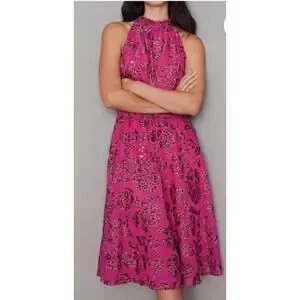Keywords: WHBM pink floral dress, midi halter dress, wedding guest dress, party outfit, vacation style, romantic feminine look.