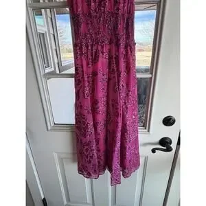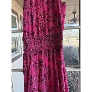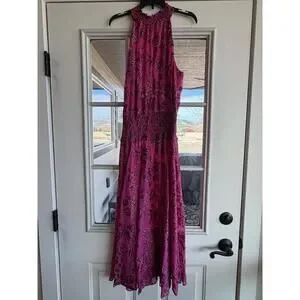 Fresh, feminine, and easy to style—this WHBM midi dress is perfect for brunch, weddings, vacations, parties, or everyday wear. The bold pink floral burnout print stands out against the classic silhouette. A smock-neck halter adds elegance, while the sleeveless cut, smocked waist, and fit-and-flare skirt create beautiful movement from day to night.