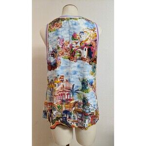 The JOHNNY WAS Los Angeles Sleeveless V-Neck Rayon Coastal Resort A-Line Top in size Medium is a stylish and versatile piece perfect for various occasions such as travel, parties, or casual wear. Made from a comfortable blend of spandex and rayon, this top features a flattering V-neckline and a pullover closure for easy wear. The multicolor design and lightweight fabric make it a great choice for summer, spring, and fall seasons, adding a touch of resort-inspired charm to any outfit. From the beach to the cocktail hour, this top offers a classic yet trendy style for the modern woman.