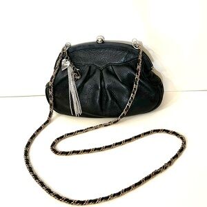 Sumptuous Pebble Leather Rhythm & Rhyme black bag with a stylish chain strap. Perfect for many occasions. Super clean inside and out. Gold, brass and silver toned hardware, goes with everything. Inside has cute music staff fabric lining, leather trimmed pocket and a zipper pocket. Quality materials and construction.