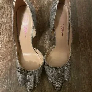 ***Excellent Condition****These elegant Betsey Johnson heels feature a shimmering silver finish and a classic d'Orsay silhouette. The pointed toe is adorned with a decorative bow, adding a touch of sophistication. With a medium heel height, they are perfect for formal occasions.
