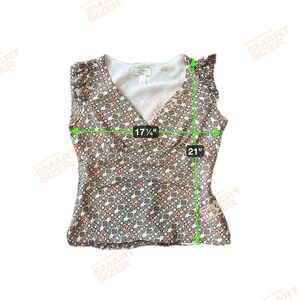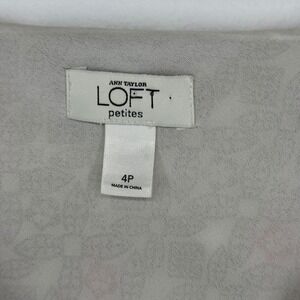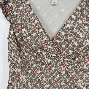 Ann Taylor LOFT Petites geometric print blouse. This top features a flattering V-neckline and charming cap sleeves with a slight ruffle detail. The all-over print offers a stylish and unique aesthetic. Perfect for a casual day out or a relaxed office environment.