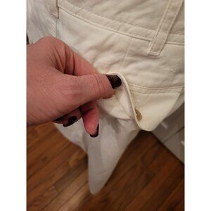 White cotton twill skirt by Lands End features classic 5 pocket styling. Skirt is made from 100% cotton and ahs button closure, functional front and back pockets, and a tailored fit. Back of skirt has a small spot on it as shown in the 5th picture.