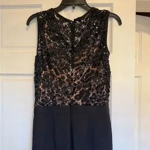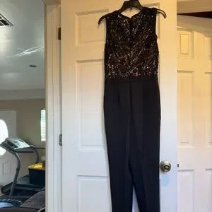 Stylish jumpsuit with tapered black pants and a nude top under black lace and sequin. Perfect for evening events.