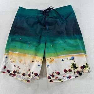 American Eagle Outfitters Green and Cream Beach Scene Swim Shorts Sz XS