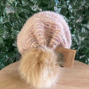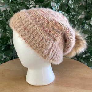 Soft knit beanie with a fluffy pom pom. Features a blend of pink and cream tones.
