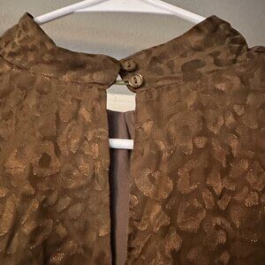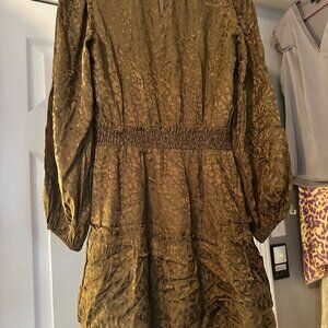 Joy Joy olive satin jacquard mini dress, new without tags. Features subtle tonal leopard/animal print texture, long puff sleeves, high neckline, smocked elastic waist, tiered skirt, and keyhole button back closure. Lightweight with a soft sheen — perfect for fall, holiday parties, or date night.