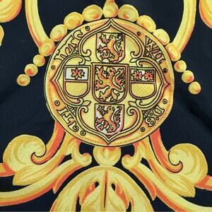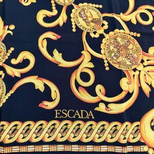 Beautiful black silk scarf by Escada with a gold baroque pattern - medallions, coins, and fleur-de-lis. Hand rolled edges. Great preowned condition, no material tag (one corner is slightly unrolled where tag originally was. Measures approximately 34”W x 34.75”L.