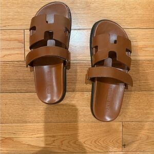 Tan leather flatform sandals by Steve Madden. Women’s 7.5. Slip on style with adjustable top strap and geometric cutout… kinda reminds you of the designer that puts things in orange boxes.