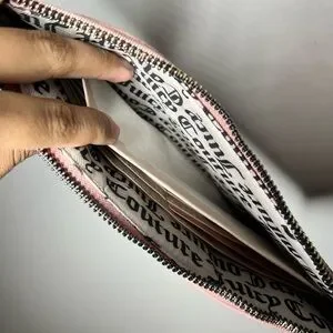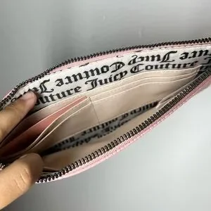 brand new juicy couture large flat wallet with wristlet. designed with four card slots and the capacity to hold up to eight cards (two per slot). clean inside and out with no callouts or stains. like new condition. measures approximately 5.5” x 9.5”