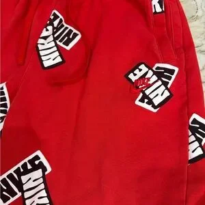 Vibrant red sweatpants with bold Nike logo patches. Perfect for active play.