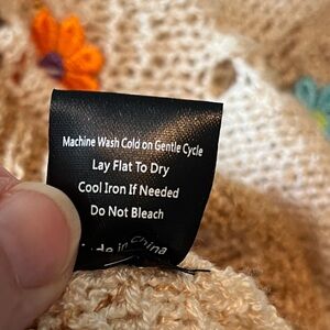 Beige knit sweater with brown accents. Intricate knit pattern. Soft and cozy texture.