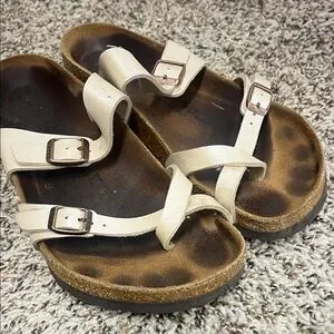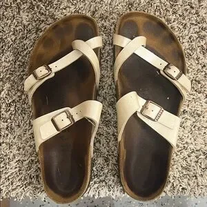 Comfortable Birkenstock sandals with tan cross-straps. Features adjustable buckles and supportive footbed.