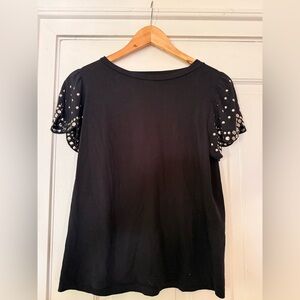 Chic black tee with unique metal stunner details on sleeves. Adds elegance to casual wear. Great condition.