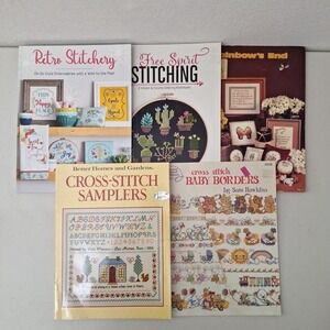 Some external shelf wear. This product is a set of 5 design books focused on stitchery, embroidery, and cross stitch, featuring a mix of vintage and modern series. The books are from various brands and are all in one size. Perfect for everyday crafting, these books offer a variety of patterns and techniques for cross stitch embroidery, making them a valuable resource for both beginners and experienced stitchers. Ideal for those interested in vintage and modern cross stitch designs, these books are a must-have for any sewing or embroidery enthusiast.