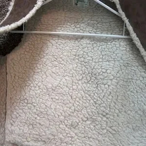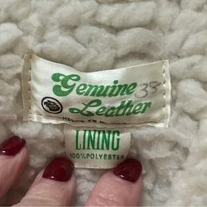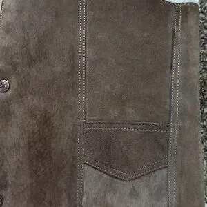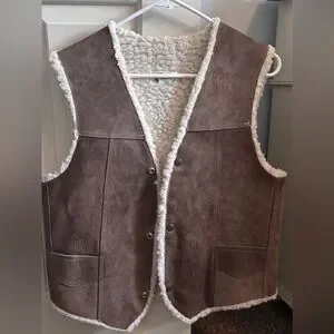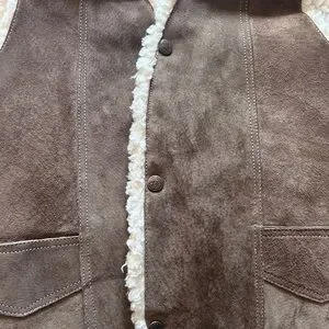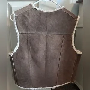 100% suede leather vest with shearling (100% polyester) lining. Made in Mexico. Has slit pockets and the cutest snaps. Can be worn over a sweater, a long or short sleeved-shirt or tank top or a dress. Perfect for all weather and for so many occasions.