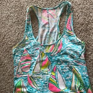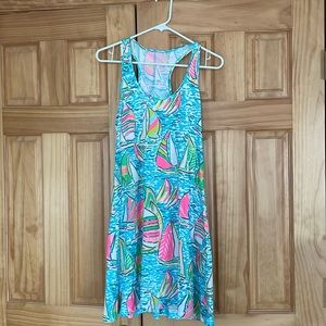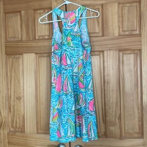 Vibrant mini dress with sailboat pattern. Features blue, pink, and green colors. Sleeveless design. Perfect for summer. In amazing condition.