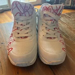 Stylish Skechers sneakers with pink heart design. Comfortable and trendy.
