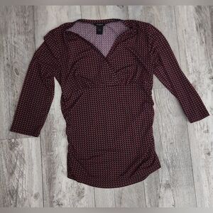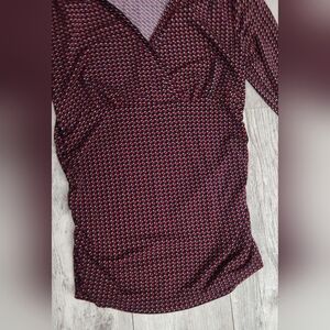 Ann Taylor Maroon Stretch Knit Surplice Blouse with geometric design. Features three-quarter sleeves. Ideal for versatile styling.